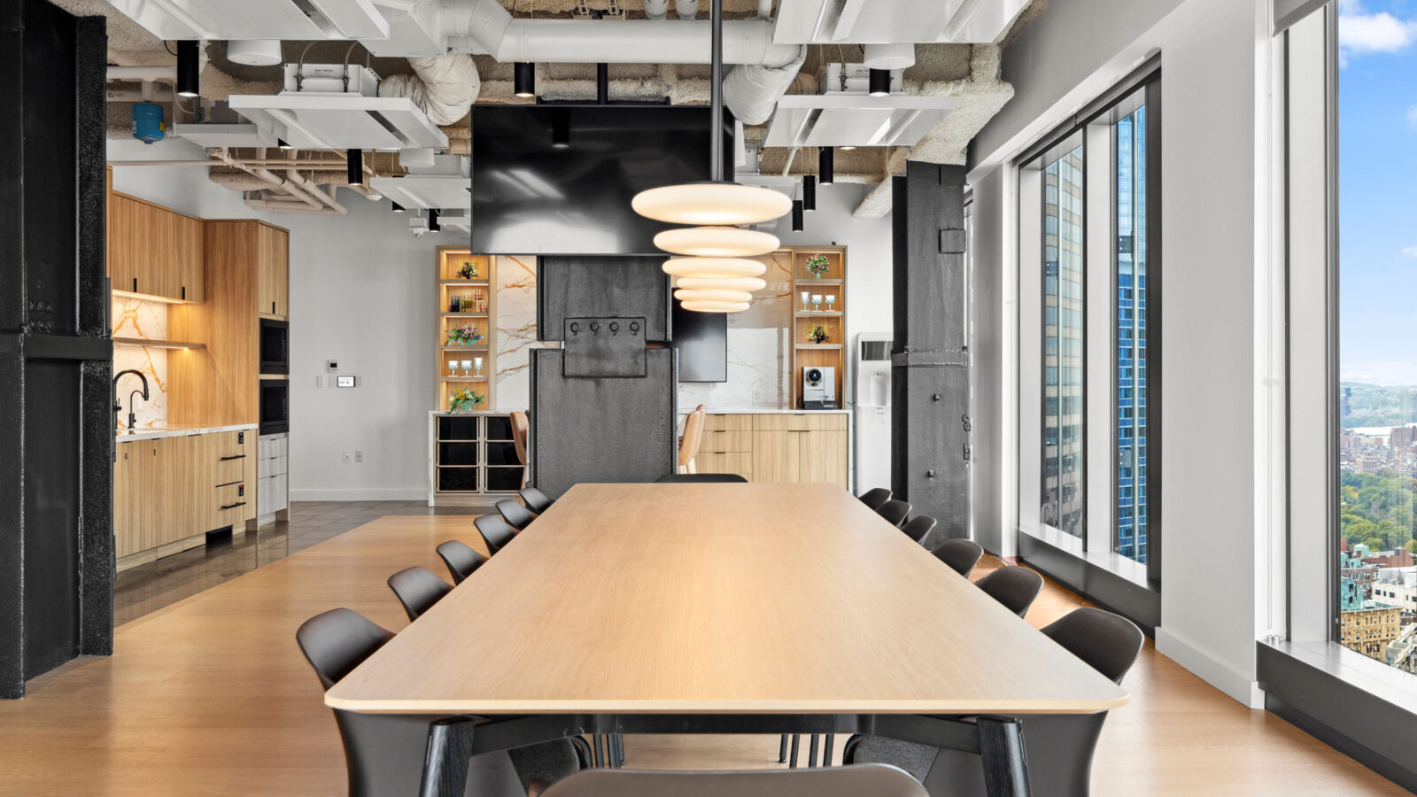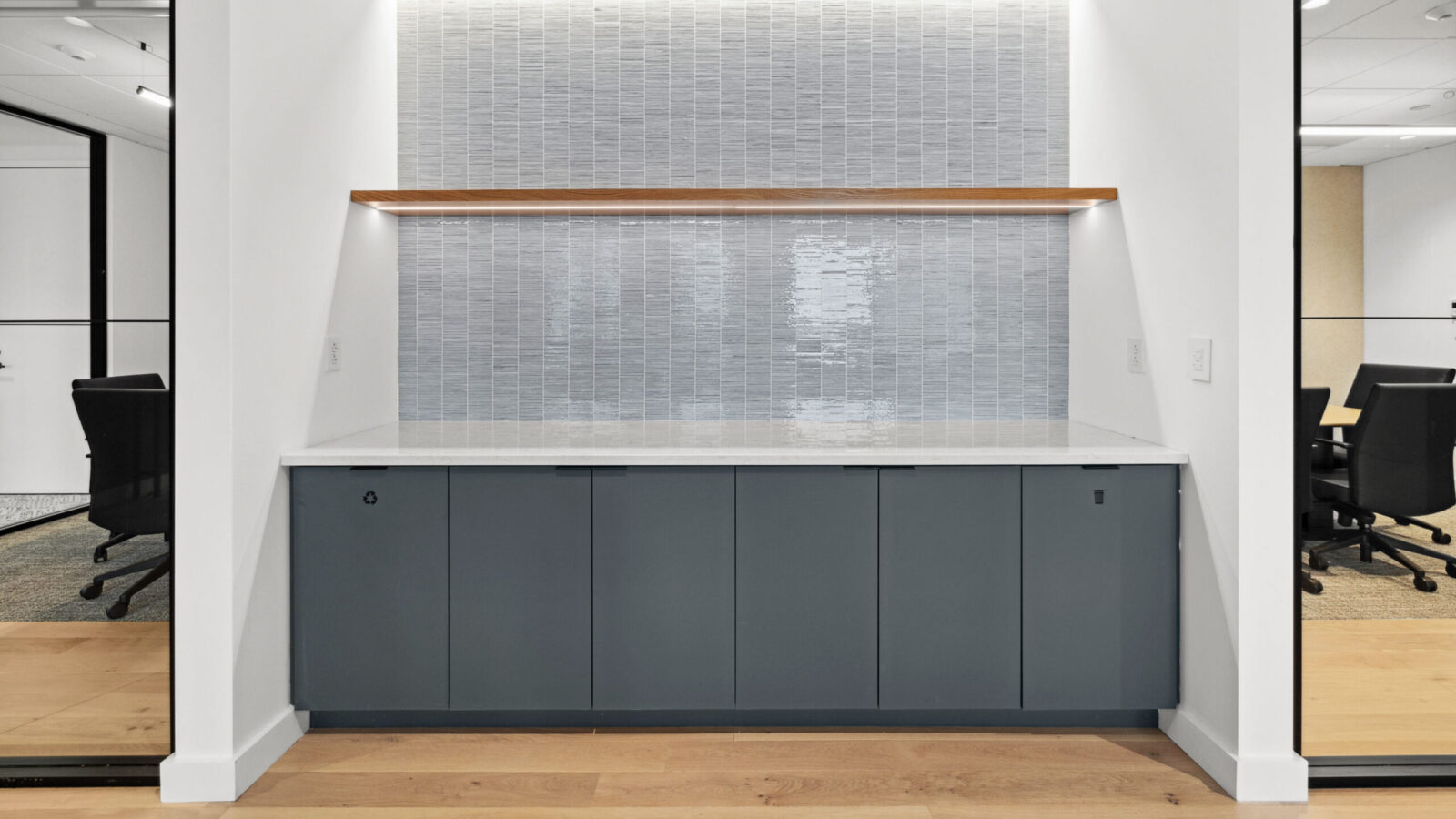 Working closely with the design team at Visnick & Caulfield, led by Daniela Maher, and contractor Columbia, EAW’s team developed thoughtful layouts for the space. The office design accommodates approximately 50 employees and features a mix of open work areas, private offices with panoramic city views, and collaborative zones, including conference rooms, huddle spaces, and café-style seating. Throughout the process, Ampersand’s executive team was deeply involved, ensuring that every detail—from layout modifications to material finishes was tailored to create a workspace that balances forward-thinking innovation with employee comfort.