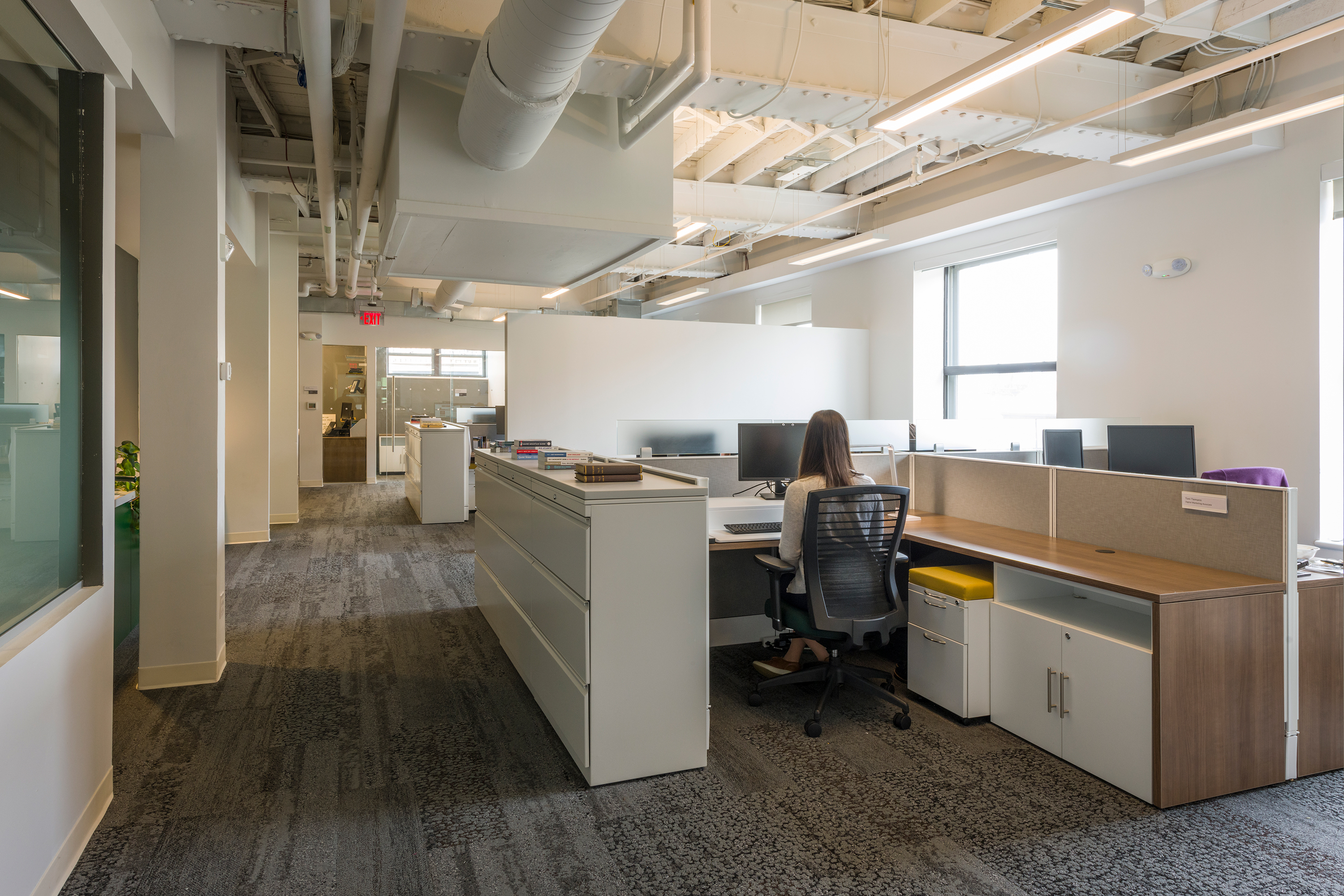 The new, four-floor space of the building, listed on the National Register of Historic Places, was completely gutted and renovated. RODE Architects oversaw the interior building renovations. The floor layout was entirely updated to optimize natural light quality, celebrate the “bones” of the building, and highlight the character of the original building construction. The original brick walls were exposed, and details were emphasized, such as the southern yellow pine wood structure.