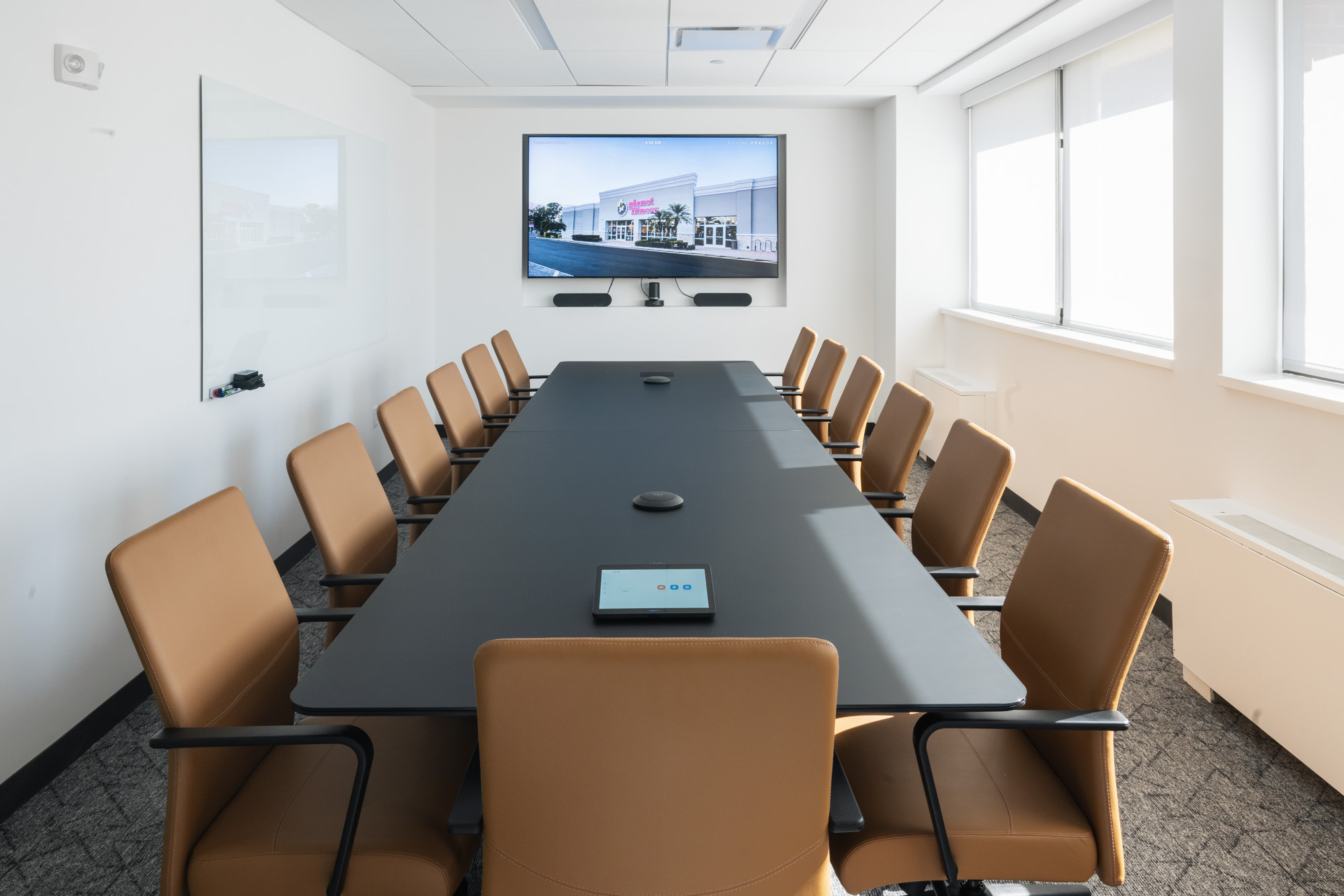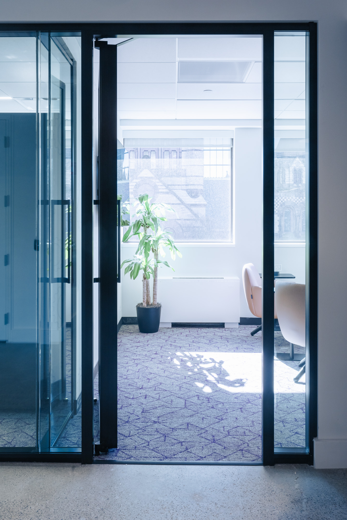 • Boardroom featuring a custom black matte back-painted glass table (Enwork) and custom chairs (Keilhauer)