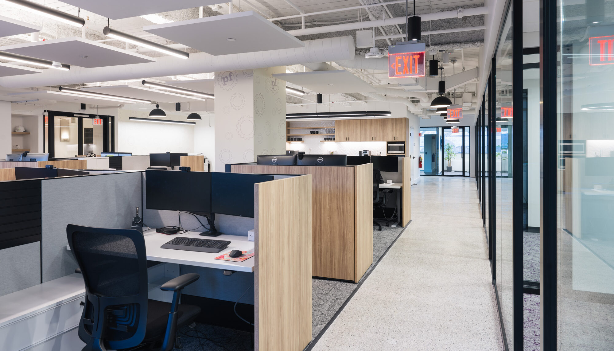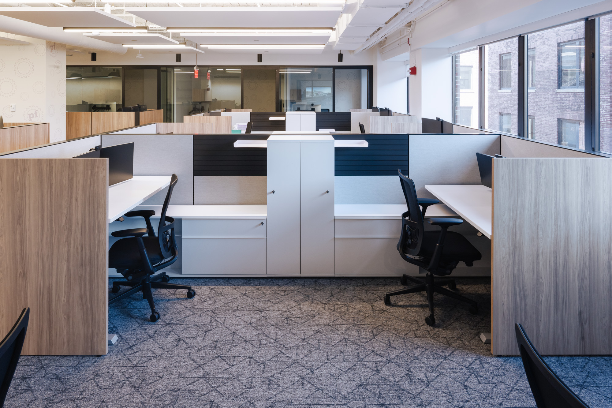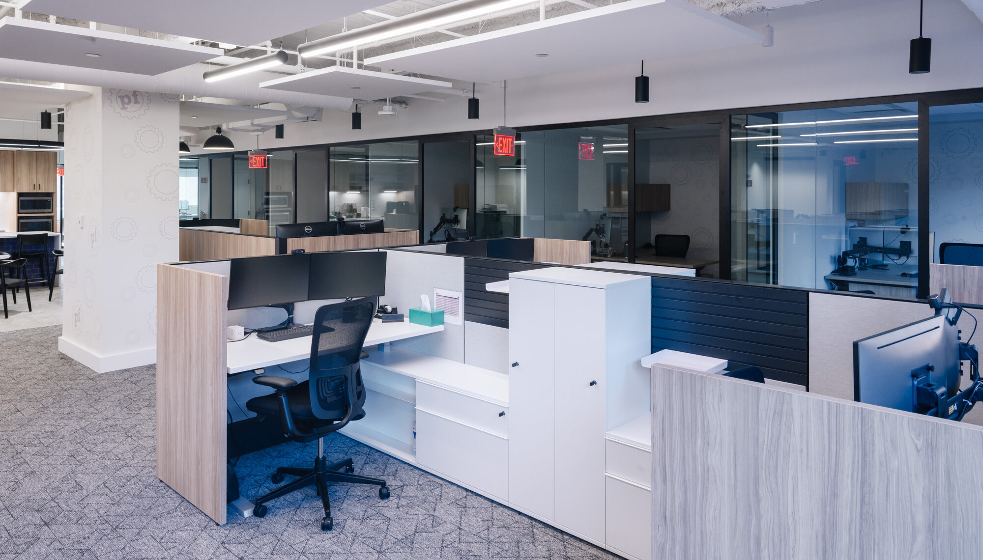 • Cohesive Look: The finishes between the millwork, workstations, and private offices were carefully matched to create a cohesive and professional aesthetic throughout the office space.