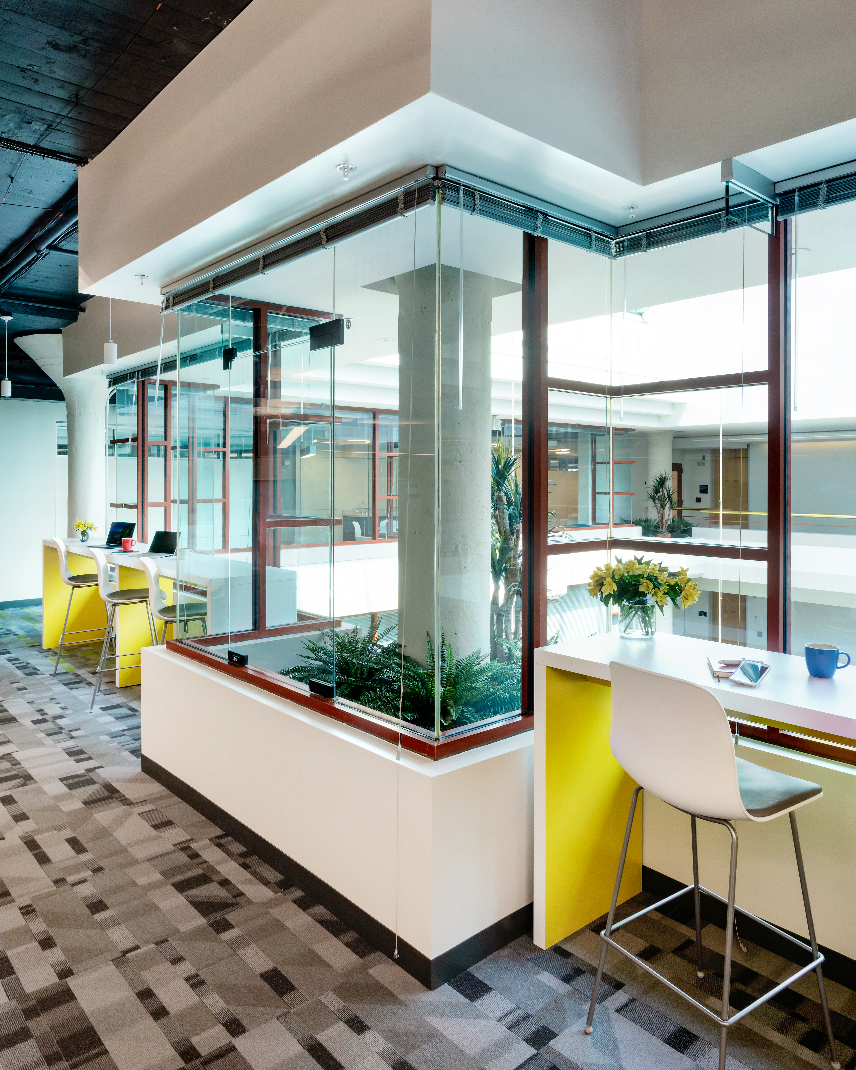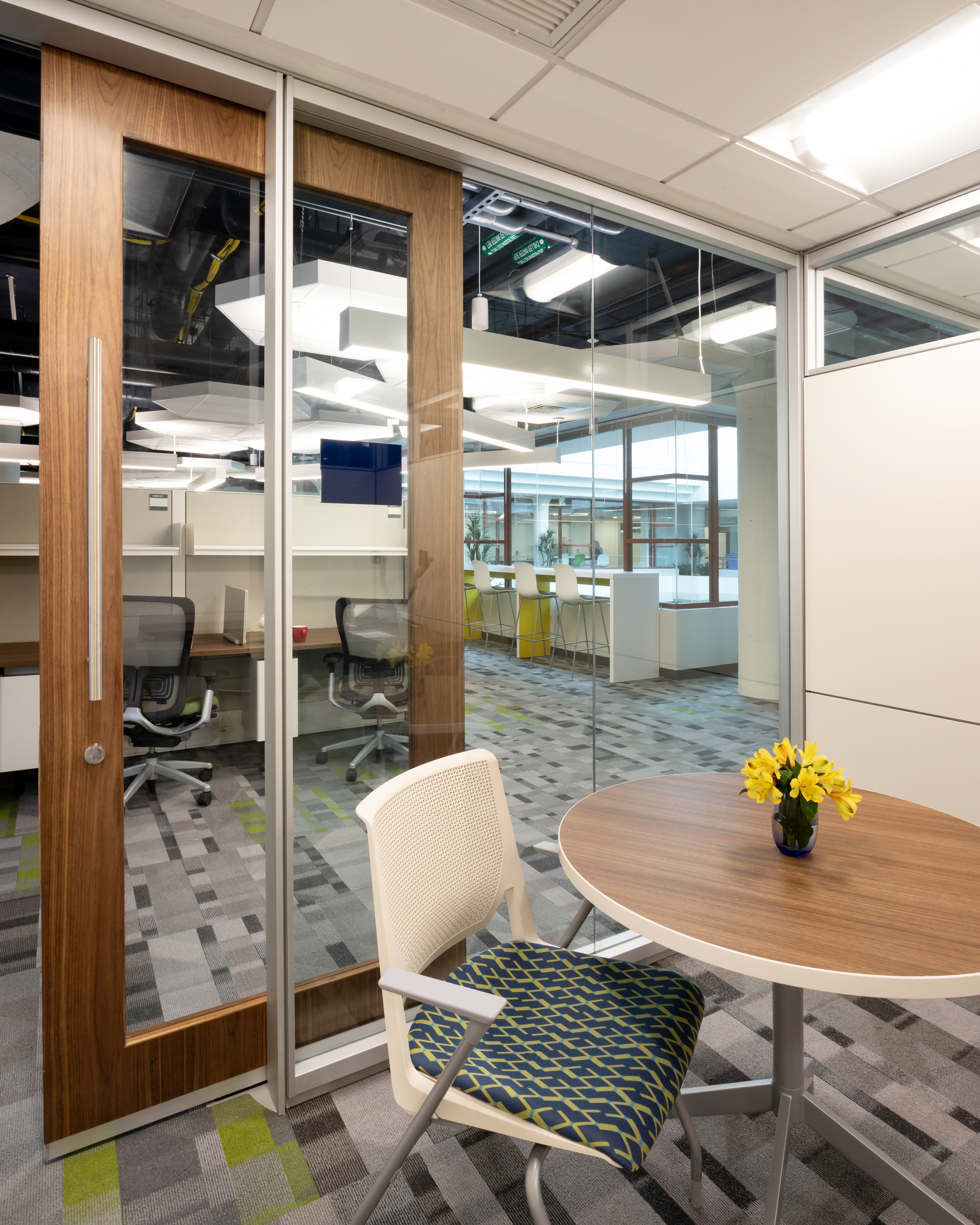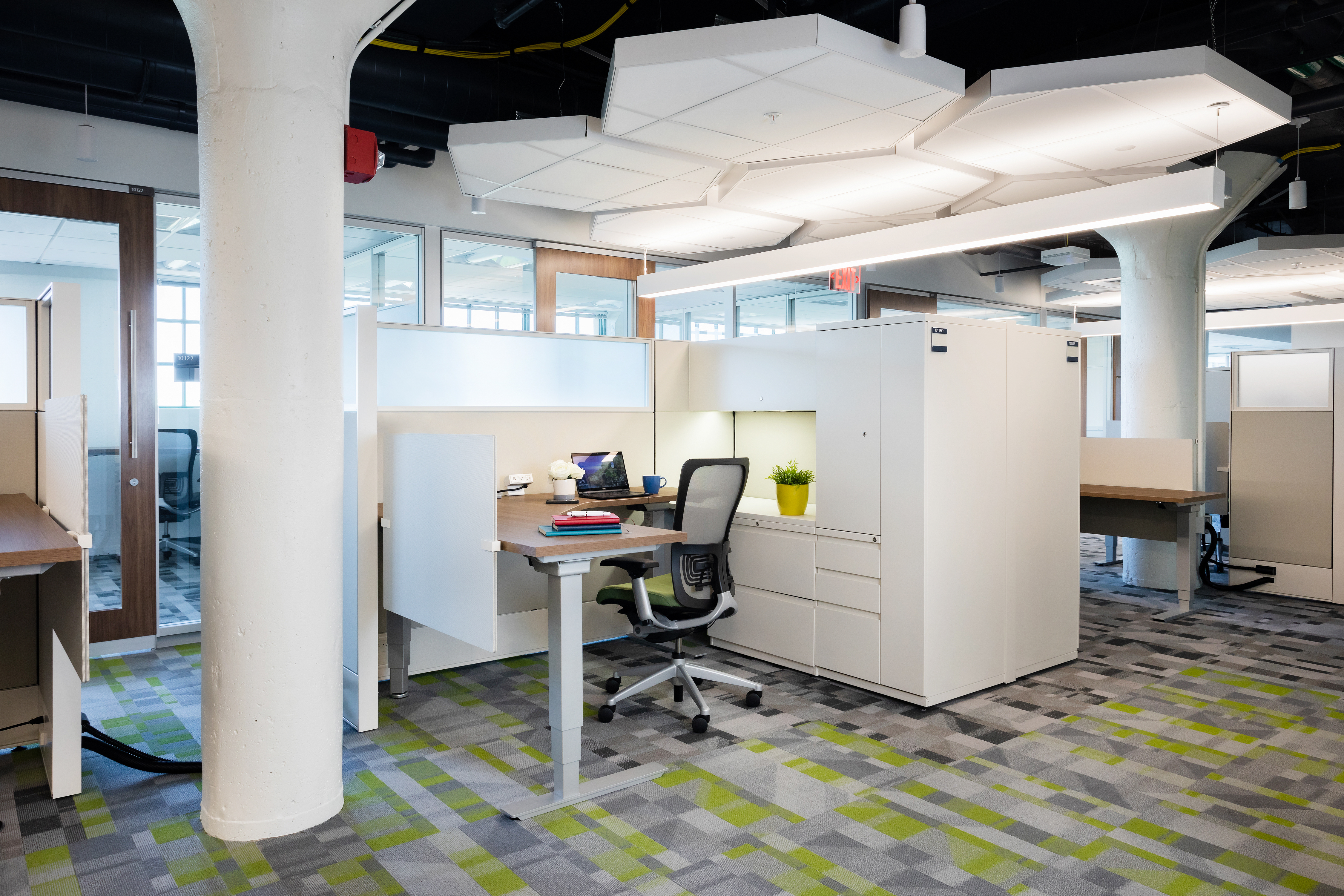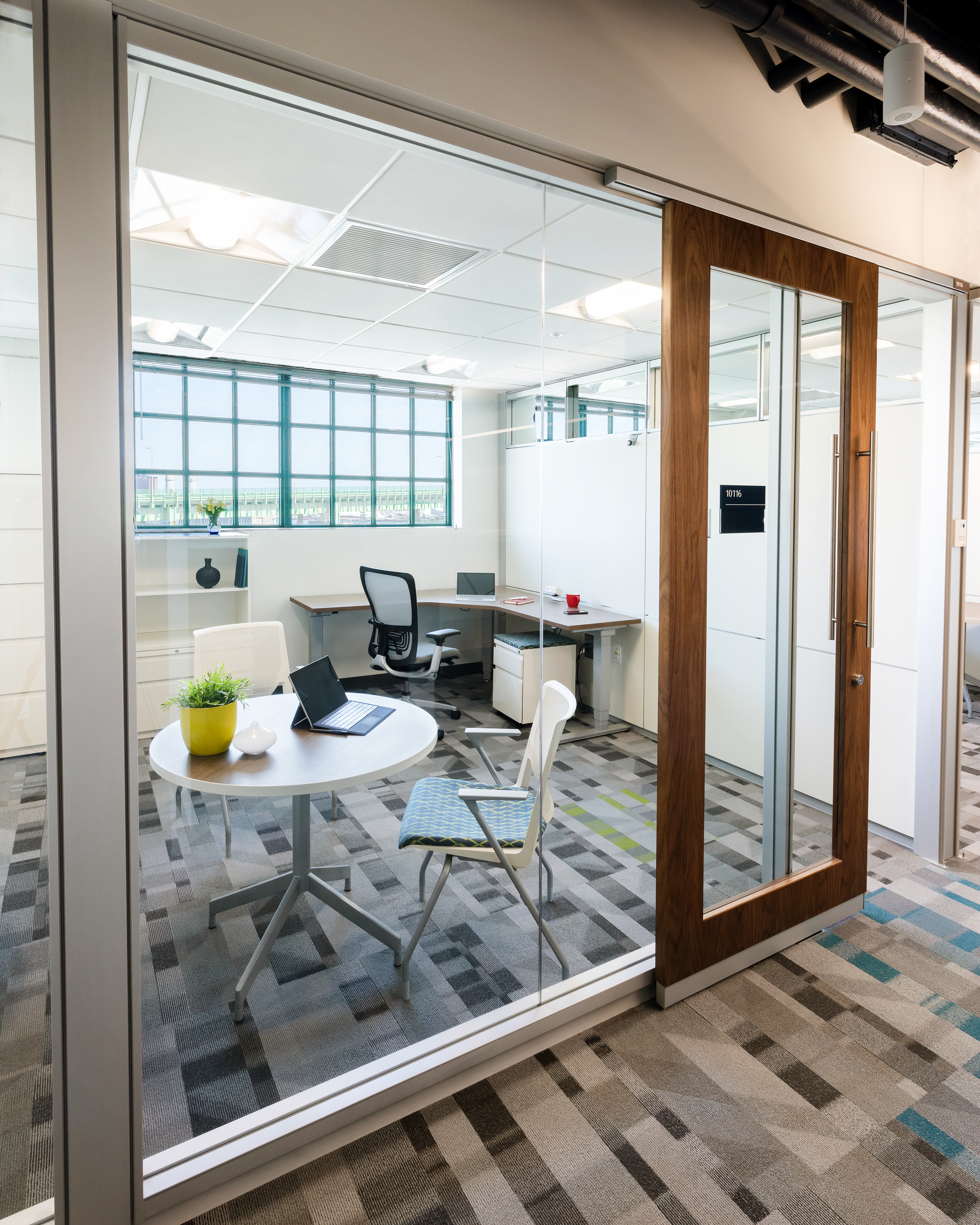 The project consisted of workstations, benching stations, private offices, shared offices, collaboration areas, and conference spaces. Pops of color were thoughtfully used in the fabrics and finishes. Products from Haworth include Compose benching workstations and private offices, height-adjustable tables, X-Series storage, and Very seating.