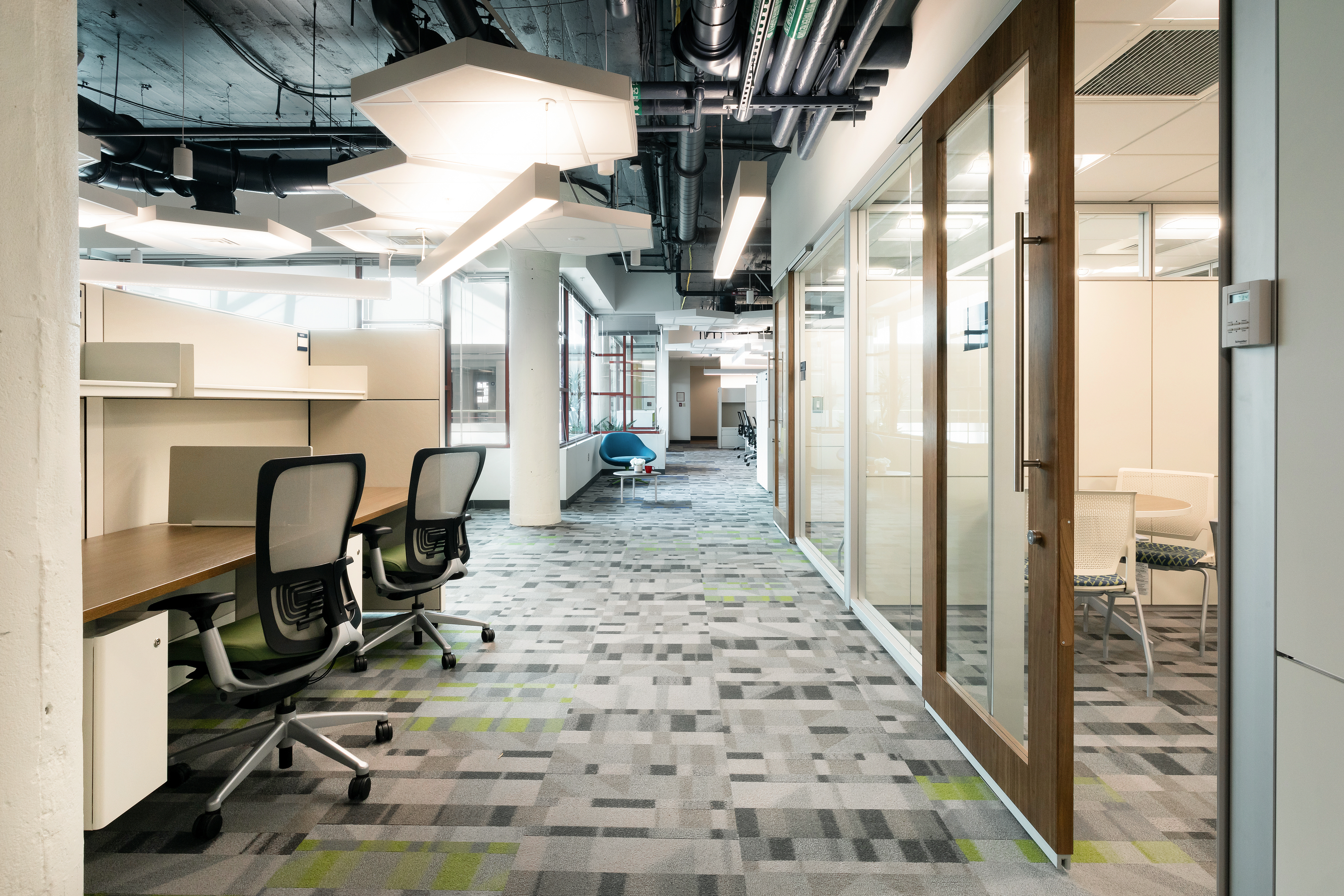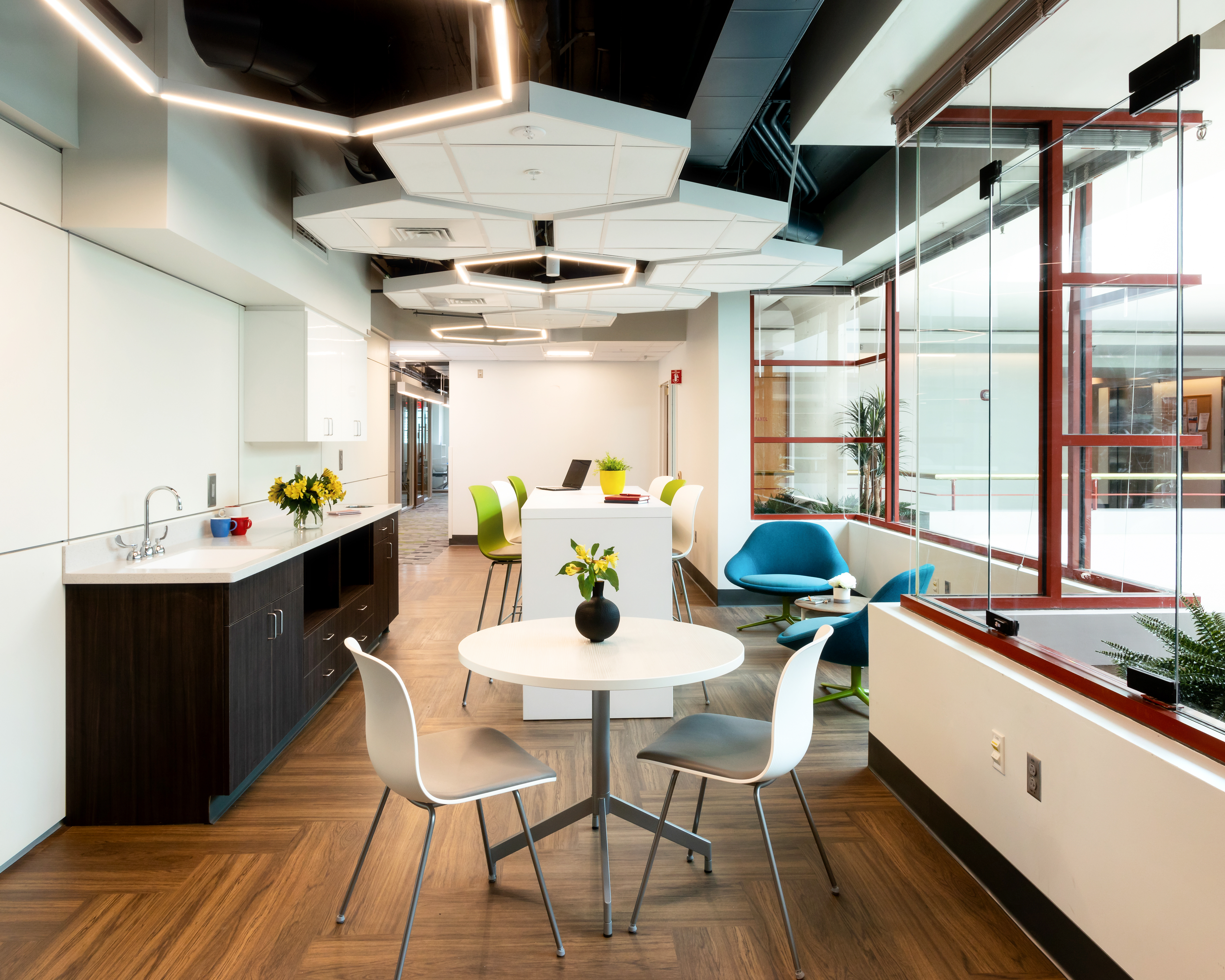 Environments at Work values its long-term partnership with MGH and has enjoyed many collaborations on facilities projects. Recently, the team completed a project within a renovated building in the Charlestown Navy Yard. The intent of the new space was to consolidate research staff from multiple locations to one building – and on one floor – to encourage collaboration across departments.